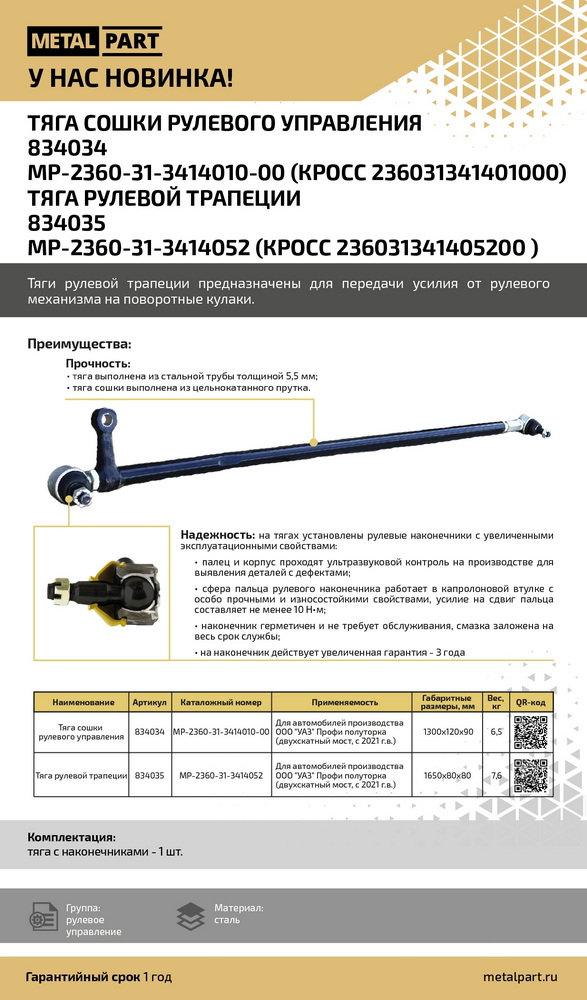 Тяга сошки рулевого управления для автомобилей производства ООО "УАЗ" Профи полуторка, двухскатный   мост, с 2021 г.в. Гидроцилиндр подъема отвала для бульдозеров Б-10, Б-11, Б-12, Б-14, ДСТ-Урал (ГЦ-100.63х1250.31) L=735 мм Кронштейн фильтра воздушного Газель, Соболь дв. 406 "Оригинал" Уплотнитель проема двери LADA X-Ray задней правой Блок цилиндров УАЗ дв. ЗМЗ-40904, 40905, 40906, 40911 в СБ с кривошипно-шатуном и поршневой группой "Оригинал" ф/уп. Брелок StarLine Twage A93/A63 Ж/К Блок управления дв. ВАЗ-21179 Lada X-Ray 1,8л. 16кл. Евро-5+  М86 (МКПП) Резонатор Газель ЦМФ, Соболь 4х4 дв. 40522 инж. Подкрылки Газель, Соболь с 2003 г.в. передние (к-т 2 шт) локеры Шприц нагнетательный рычажно-плунжерный V= 120 см/куб пистолетного типа